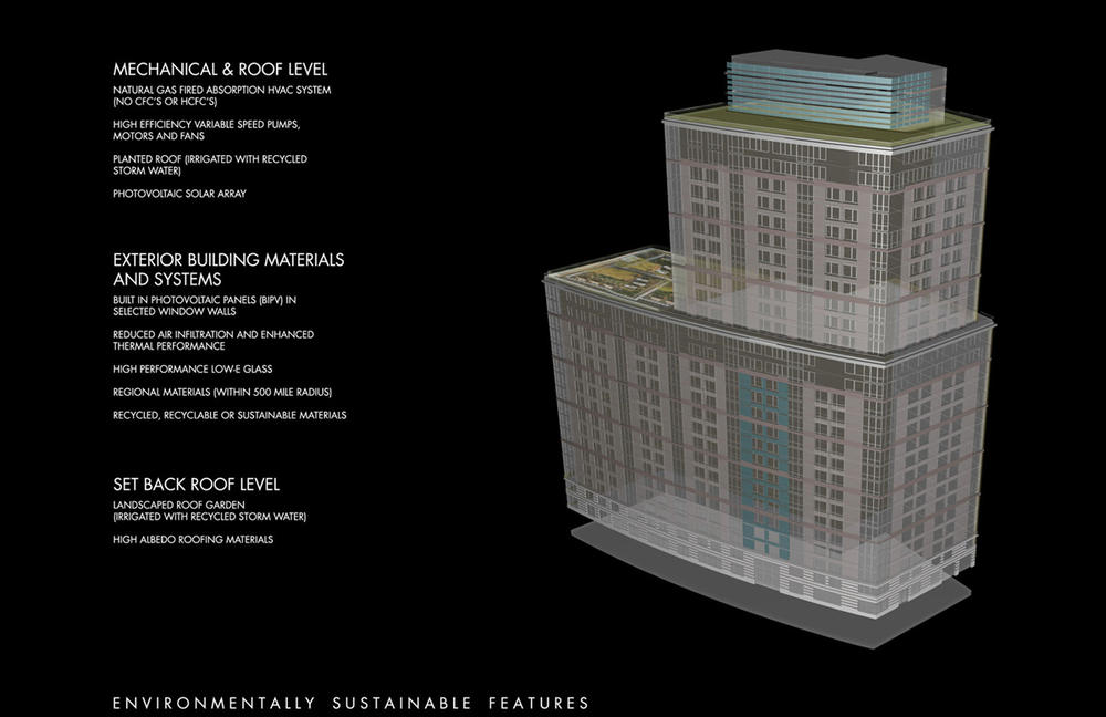 The stormwater retention system is designed to retain 10,000 gallons of stormwater in a tank located in the basement. Within this tank is a sediment basin and treatment system. The retained water is reused for irrigation for the vegetated roof and adjacent park. The planted roofs and high-albedo roofing materials minimize the building's contribution to the urban heat island effect.