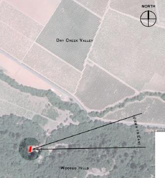 The approach was to minimize impacts on the site and take advantage of site conditions for cooling. The site is a sloping, east-facing meadow, cleared over 100 years ago, surrounded by oaks and conifers, overlooking the vineyards of the Dry Creek Valley in Sonoma County. This meadow sits above the vineyards as they merge with steep hillsides. Careful site analysis determined that steep hills to the west and south limit good solar access and passive heating. This condition keeps the house cool in summer. The most exposed condition, the glassy bay facing the eastern view, was located to be shaded by a large black oak.