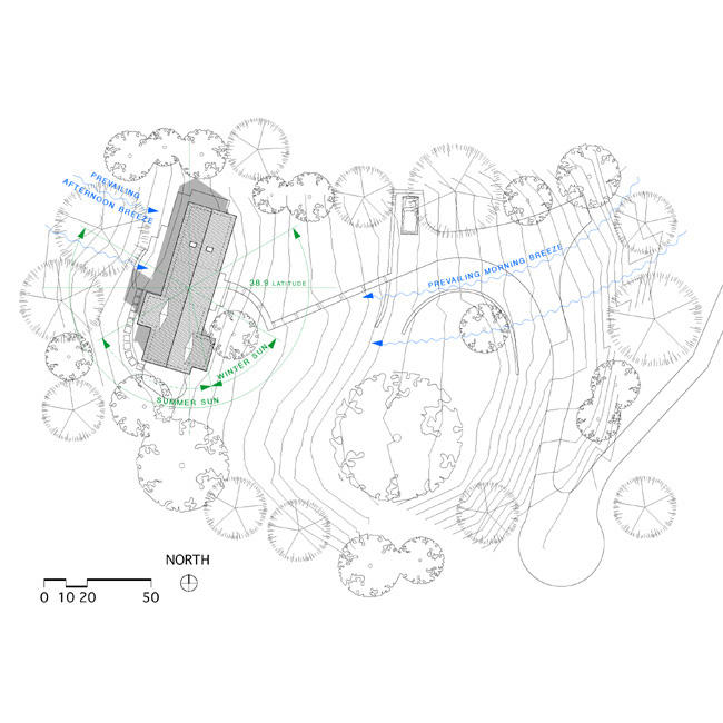 A careful site analysis showed that good solar orientation provided few benefits on this site since the sun was blocked by the surrounding hills for many months of the year. Based on this analysis, the design team (the architect, structural and mechanical engineer, working collaboratively with the client) decided that the best strategy for saving energy was to keep the building cool during the hot summers without mechanical cooling.