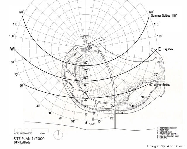 A graywater system supplies the public and staff toilet facilities. The collection system occurs through the terraces surrounding the building. The un-guttered roofs also supply the graywater collector. Waste and wastewater is piped below the pedestrian bridge back to the sewer system on the mainland to avoid pollution of the high water table or the adjacent lake water. Paved access areas to the building use interlocking concrete paving units with sand setting, allowing water permeation and minimal runoff.