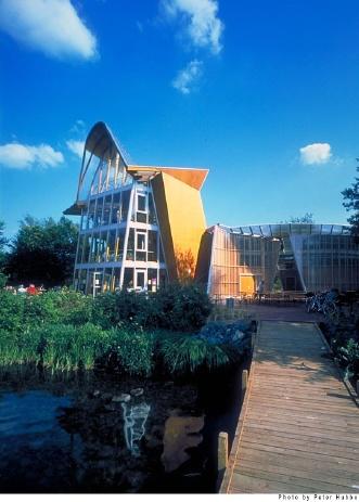 A cogeneration microturbine fueled by rapeseed oil provides backup power for extended cloudy days and supplemental power for peak loads associated with the cafe equipment. High standards of energy conservation, including natural ventilation, daylighting, thermal-mass storage, and building automation, reduce power consumption.