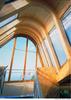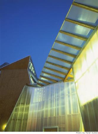 Major construction materials consist of wood, translucent wall panels and windows, and metal stairs. All wood used, including wood studs, plywood, glue-laminated beams, and timber framing, was certified reforested wood from central European sources. Recyclable materials used include aluminum and glass curtain wall, concrete floor pavers, mineral-fiber insulation and polycarbonate translucent panels.
