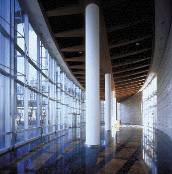 Daylighting greatly reduces dependence on lighting systems in the office tower during daylight hours. Only high-efficiency, compact fluorescent fixtures are used for general illumination in the tower. This system is supported by limited amounts of incandescent accent lighting and sufficient power to support task lighting.
