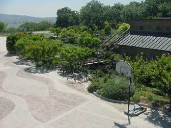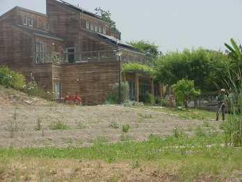 Numerous environmentally sensitive site actions were implemented during design and construction. Access to the site was optimized so that only one tree was cut down to clear the site. Construction required minimal excavation that left the natural topography closely intact. North side buildings are tucked into the existing hillside and backed with concrete retaining walls for thick thermal mass. The building facing the pond is raised on piers to generate natural cooling airflow beneath the structure during the summer. Outdoor trellises and roofs covered with vines and plantings add shading, provide food, and green the arid topography. The varied layout of food production and landscaping aids soil fertilization and irrigation that reduces the consumption of water, energy, and other materials. The whole site is part of an organic approach where fossil fuel-derived fertilizers and other chemicals are not used. Composting of agricultural waste is encouraged to help enrich the clay topsoil and provide mulch for the crops.