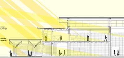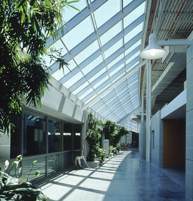 A daylit interior "street" serves as the spine of the building. Roof monitors, skylights, and sloped glazing work together to allow for effective daylighting throughout the entire building; the natural light and view to the outside are accessible by all building occupants. The configuration of the building is relatively narrow and only one or two stories high, allowing for optimal daylighting. Sunshades are operated when needed.