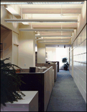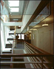 - Ribbons of glass around private offices, open-ended hallways, and an open interior staircase all help distribute natural light, captured through skylights and windows.