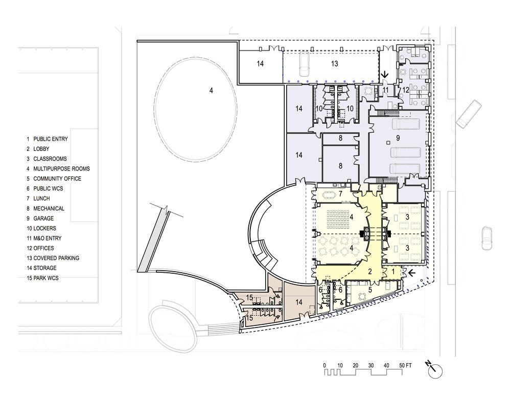 Program: The 13,300-square-foot ground floor is divided into the northern section which houses the maintenance facilities for the Department of Parks and Recreation, and the southern section which is a community center run by the non-profit Open Space Alliance. Each program area has its own separate entrance.