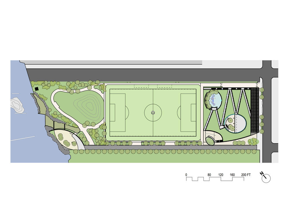 The sloping roof allows the entire building footprint to be usable park area, while an artificial turf field accommodates over 1,000 users per week. Bioswales flank the park paths to the waterfront, where a grass knoll and a permeable plaza give a tree-shaded overlook. The waterfront supports marine and avian life, with an off-shore island, a varied rocky edge, and marsh plantings.