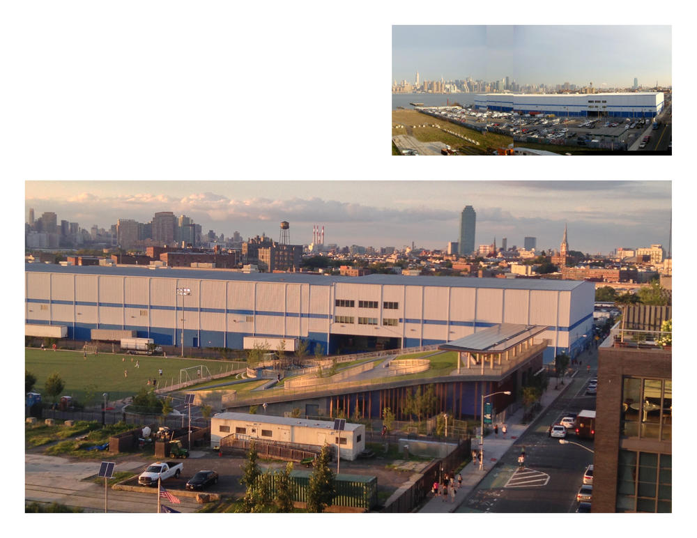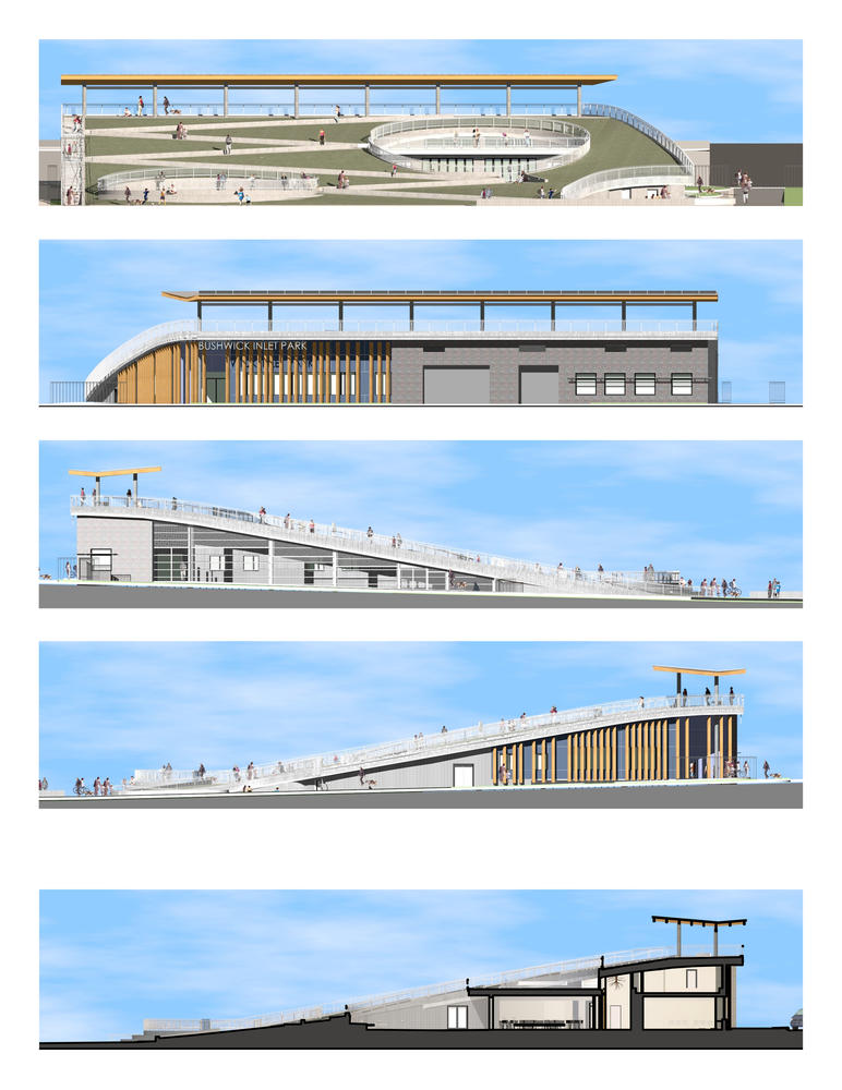 Predesign: Following the passage of the 2005 rezoning plan, NYC Parks developed the Greenpoint-Williamsburg Open Space Master Plan, with the goal of eventually building up to 50 acres of waterfront park along 1.6 miles of the East River. Due primarily to unexpectedly high soil remediation and land acquisition costs, this Plan has been slow to implement, which has frustrated the local community. Bushwick Inlet Park was the first major portion constructed. Because of this, a primary design goal was to maximize open space to the greatest extent feasible, which informed the shape of the building.
