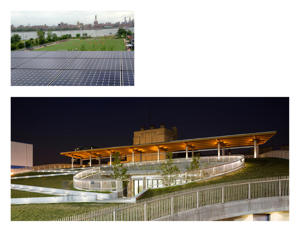 The Park wraps over the building on the west side, turning the building into a green hill so that 100% of the site is accessible to the public. A zigzag path provides ADA access to the top, where a large wood-framed canopy provides shade and views over the play fields to the Manhattan skyline. Direct building access for the public and the Parks staff is provided from the street edge below.