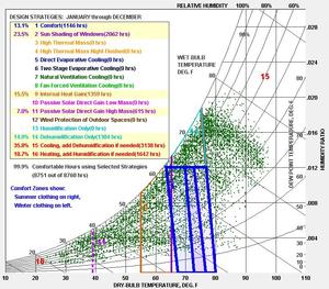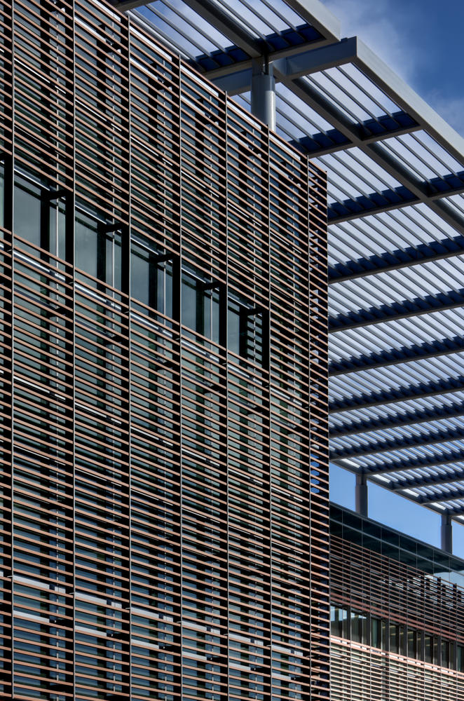 As a result of the bioclimatic study, many climate-specific design strategies emerged to reduce loads and peak electric demand for the building, resulting in smaller HVAC equipment. Studying the local climate and sun path led to a number of passive design strategies to mitigate heat gain, including extensive façade shading (terra cotta baguettes), strategically placed overhangs, shade-inducing massing, and high-albedo “cool roofs” (83% reflectance). Other energy efficiency measures included a high-performance HVAC system, increased roof and wall insulation, reduced lighting power (by 18%), and low-flow fixtures that cut domestic hot water needs.