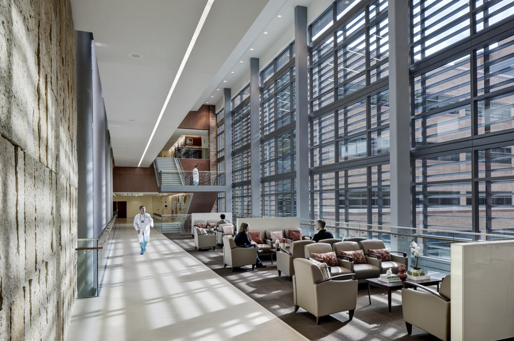Much of the program is irregularly occupied clinical and diagnostic space that the client preferred to have little or no connection to the outdoors, so only about 13% of the total program is appropriate to use daylight as the dominant light source. However, the design pays careful attention to natural light in the patient areas and public and gathering space, particularly for the burn unit. As noted above, the terra-cotta brise soleil, which covers the entire façade of spaces dedicated to patient rooms and burn treatment, reflects light while protecting patients from direct sun exposure, which can be extremely harmful and painful. Patients and staff enjoy light and views without heat or discomfort. Thermal comfort and indoor air quality were priorities, and the project meets or exceeds all ASHRAE and LEED benchmarks.
