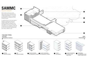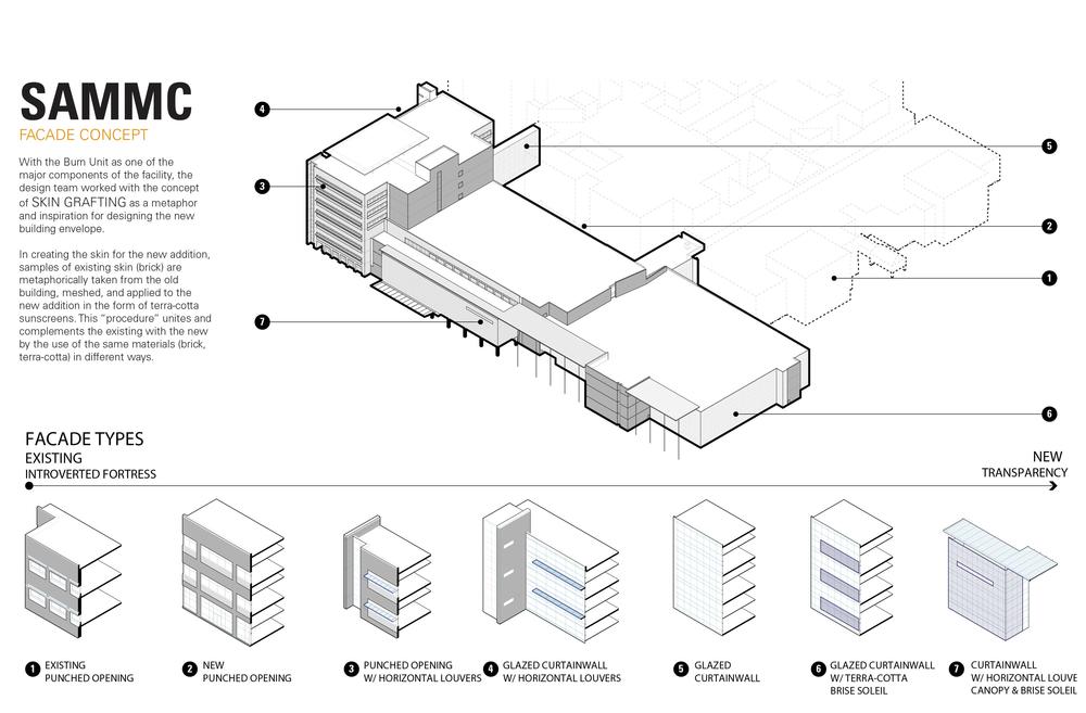 SAMMC is home to a world-class burn treatment and recovery unit, and the design both accommodates this function and draws its architectural inspiration from it. During skin grafting, surgeons remove thin, healthy skin samples from a donor and perforate and stretch them to form a mesh that allows small samples to cover larger areas. Similarly, the brick skin of the existing building is reinterpreted in the skin of the new building as a lighter, terra-cotta mesh sutured onto the new façade. The dense screening protects burn patients from direct sun exposure while providing positive views and breaking down the scale of the exterior with striations of light and shade. A long trellis canopy spans the length of the south elevation, throwing dappled shade on the building and presenting the welcoming image of a large veranda. Under this umbrella, the footprint of the façade varies to break down the scale of a very long elevation while self-shading the building as the sun moves toward the west. Surfaces at the front edge have no fenestration, avoiding heat gain, while the surfaces at the back of the trellis are extensively glazed and shaded. These simple architectural gestures humanize the scale and image of the medical center while aiding environmental performance.