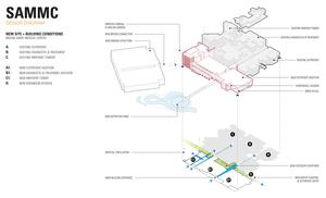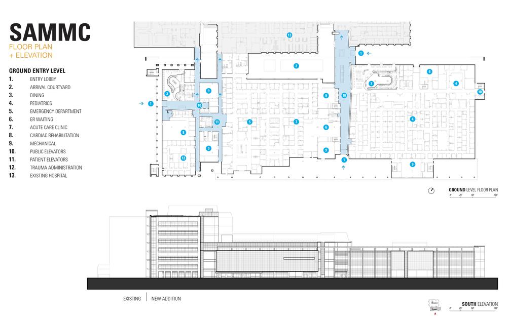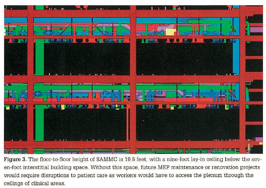 In the building, an innovative design feature dramatically improves flexibility over time. The floor-to-floor height of SAMMC is a generous 19.5 feet, in order to include a 7-foot interstitial mechanical space in order to accommodate future changes without disrupting patient care or requiring costly and wasteful renovation.