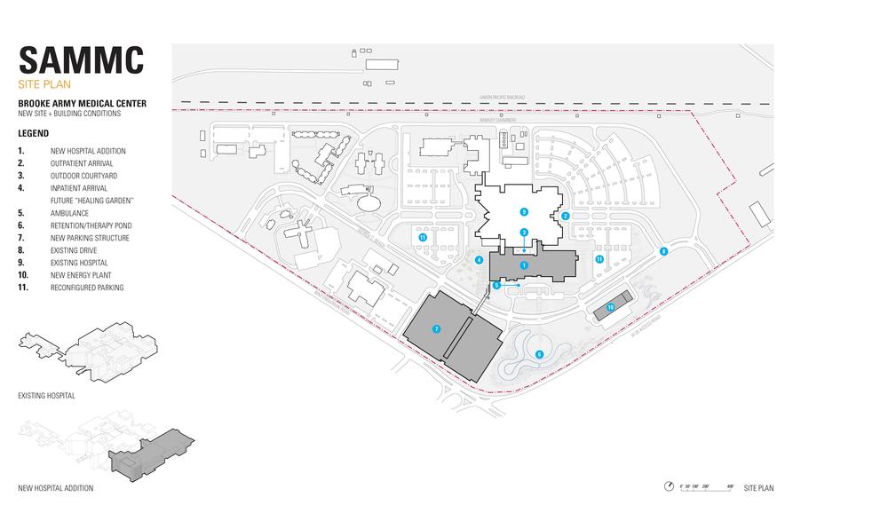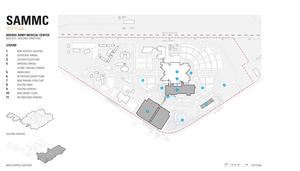 SAMMC is easily accessed by alternative transportation and commuter routes. Two bus lines and multiple bicycle paths pass within a quarter mile of the entrance. Bike storage and shower/changing facilities are provided for staff. The site sits within half a mile of ten community services and a residential district with a density of 12.9 units per acre. The project consolidates multiple functions previously located in remote and separate locations, which improves accessibility for the community and commute times for staff. The client’s goal of creating a more inviting presence for the medical center was motivated in part to address community perceptions of the existing facility as a “fortress” or “bunker,” an uninviting military presence in the region. The soaring canopy, visible from outside the campus, offers the community welcoming image, which the client has described as “an icon of hope and healing.” This strategy also aims to give greater pride of place to the staff, which represents a sizeable portion of the regional population. Finally, SAMMC is the first military medical center to locate a helipad on the roof, allowing patients can be transported into the facility much more quickly due to this departure from standard military hospital design.