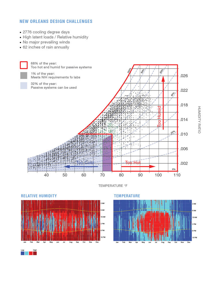The New Orleans climate alternately delights and exasperates: mild winters, hot humid summers with little wind, abundant sunshine punctuated by periods of intense rainfall and the occasional hurricane. Less than 1% of the hours in a typical year fall in the range of temperature and humidity required by the NIH for biotechnology labs, and 68% of the hours are either too hot or too humid. The provision of high air-change rates and once-through ventilation air with tight temperature and humidity control dominates lab building energy use, dwarfing skin loads.