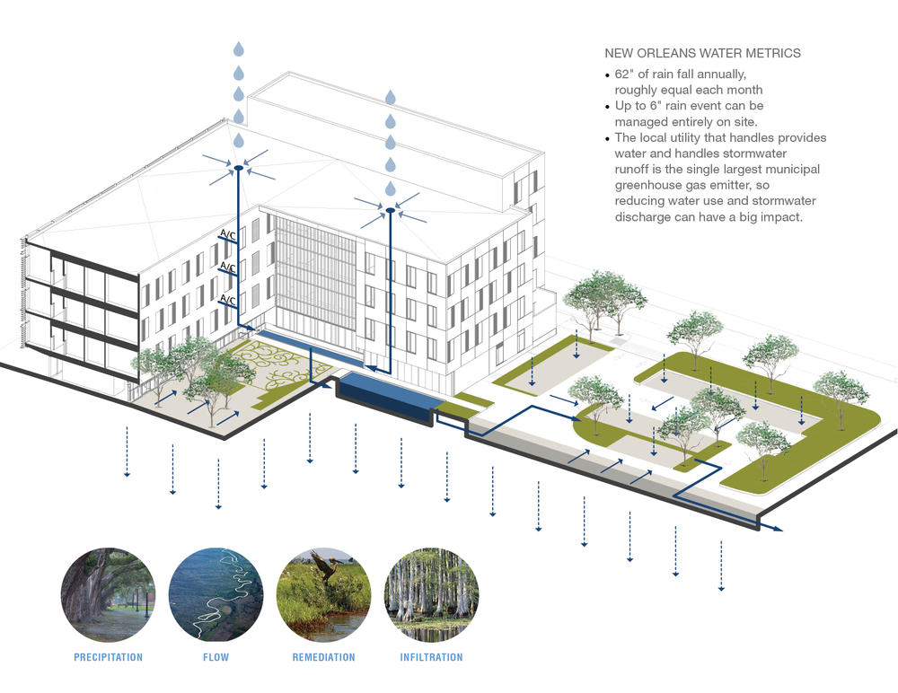 Building a laboratory building in post-Katrina New Orleans raises three challenges: how to create a low-energy lab in a hot humid climate, handle water wisely in ways that connect people to their environment, and provide a modern, sleek facility that allows entrepreneurship to flourish in a resilient new economy.