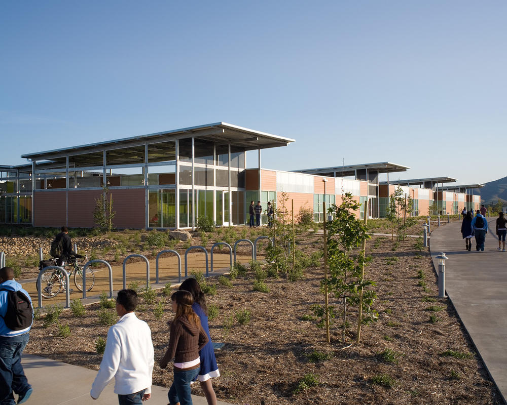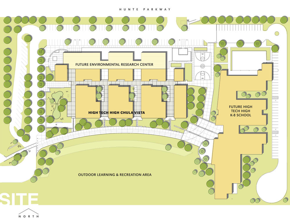 The High Tech High site is situated at the edge of the land mesa overlooking the Otay River Valley to the south. The site and the surrounding land historically had been grazed with livestock, which denuded the land of native vegetation. The site design of the school addresses this condition by layering development to decrease intensity of use as one moves south towards the mesa edge.