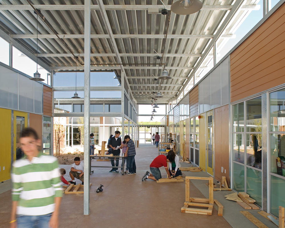Though all occupied areas have air conditioning for extreme weather days, all classrooms have operable windows for natural ventilation. Break-out spaces (called studios) between classrooms and hallways are passively conditioned. A large, photovoltaic-covered canopy shades these areas, and the areas are enclosed with an aluminum storefront system with screen mesh in the upper panels and glass in the lower panels. This allows heat to rise and escape, and moderates the occupant-level temperatures.