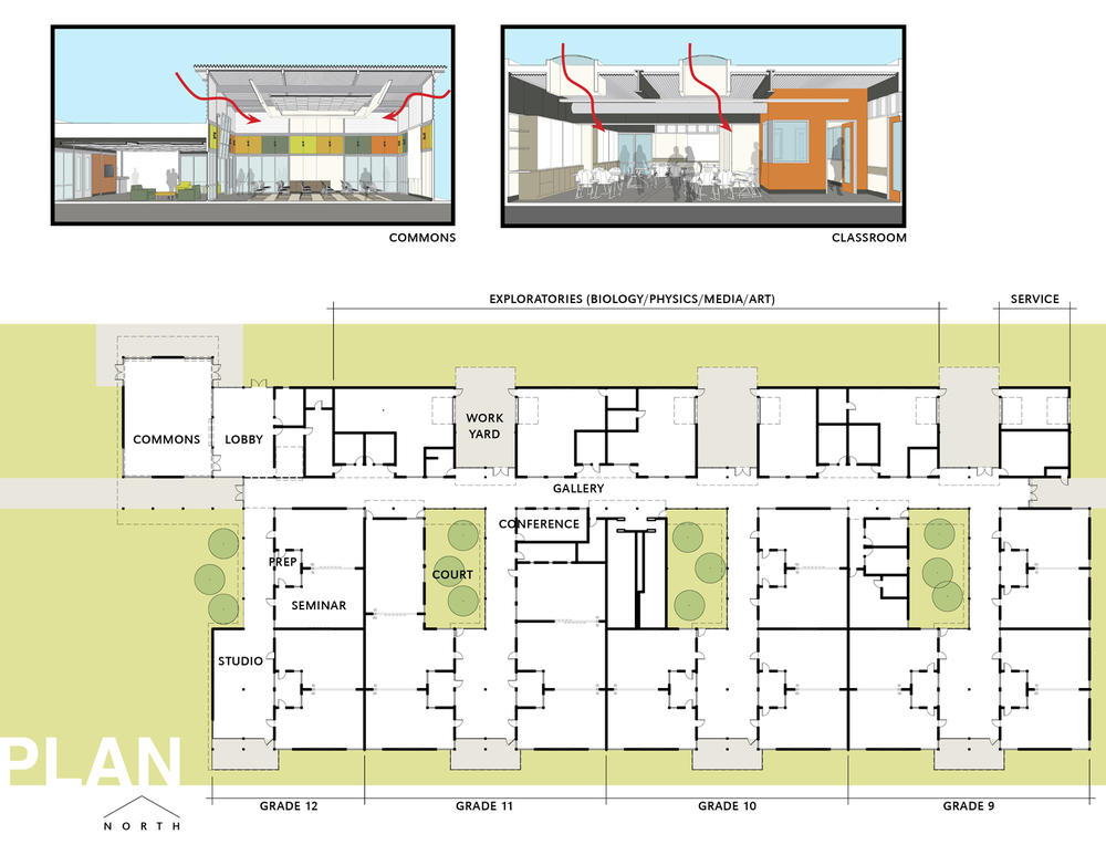 • a compact floor plan with classrooms around courtyards for natural ventilation and daylighting