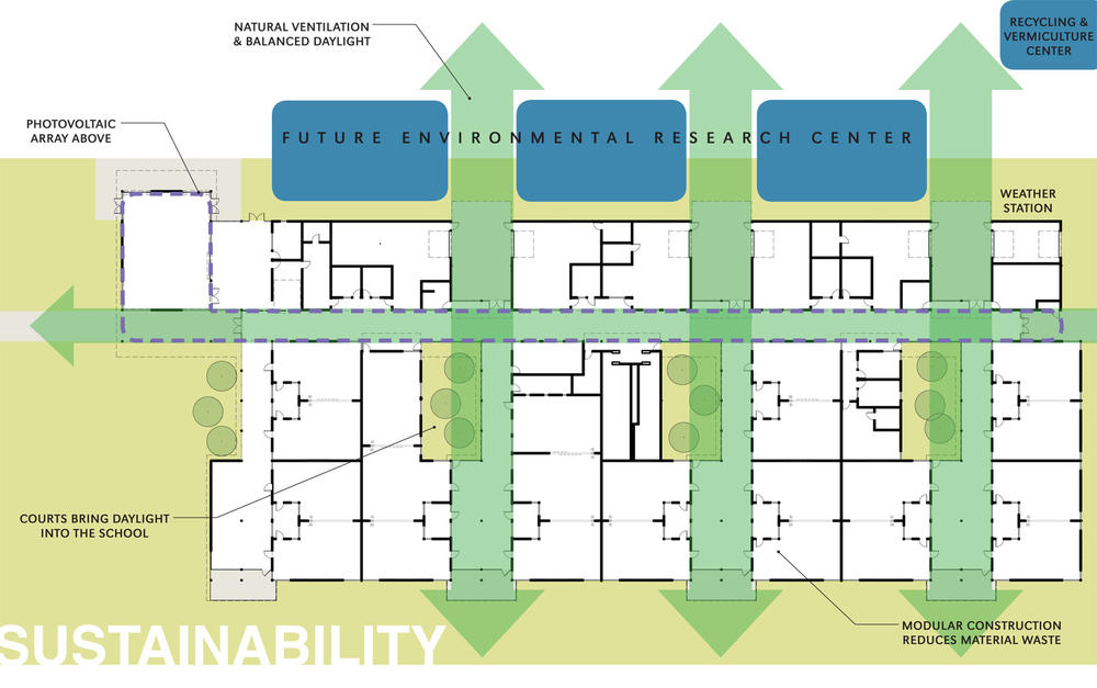 The school layout was developed with known modules and delivered to the site ready to be assembled into whole building wings in a matter of days, drastically reducing on-site construction time and the air, noise, and stormwater pollution associated with on-site construction activities. In addition, these modules can be easily disassembled, relocated, and reused in the future.
