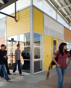 High Tech High was constructed with a mix of both custom factory-built components and more traditional onsite components. By using repetitive parts that are based on industry standard sizing and using assembly-line production, construction waste was dramatically reduced, and construction quality was greatly increased. The assembly-line technique allowed cost-effective and schedule-efficient integration of all building systems, which saved on construction labor and the cutting, fitting, and patching so necessary in traditional wood-framed construction.