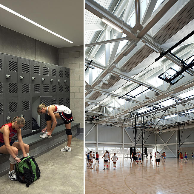 Daylighting and ventilation strategies shaped the building sections through placement of operable windows, sun shading protection, and orientation to take advantage of passive lighting and air movement. The building’s longest facades face the north and south to maximize daylighting and reduce heat gain from the western sun. The gymnasiums, with sawtooth skylit roofs, are placed north of the classroom and administration areas to avoid blocking sun and air access to these areas. The classroom roofs are sloped, in part to provide for the future placement of solar panels.