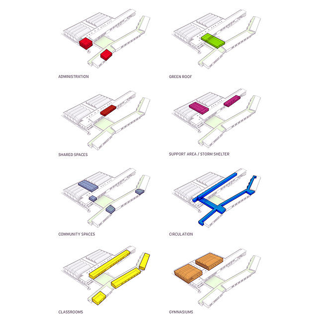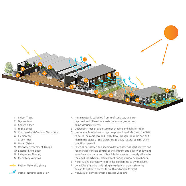 The design process focused on daylight optimization in occupied spaces, because of the known impact on academic achievement. Two single-loaded academic bars, each with an east-west orientation, optimize solar orientation and prevailing breezes. The lower and middle schools are in the southern bar, which bends to allow three distinct zones for preschool, elementary, and middle school. The high school is located on the second floor to the north and is placed above key support functions, including the cafeteria and distance-learning facilities. The placement of the high school was partially symbolic, denoting the advancement to higher grades.