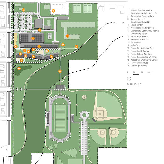 The team used a site master planning process to determine the best location for proper building orientation to maximize passive solar and wind opportunities for the school building, minimize site impact by maintaining the existing storm drainage flood path through the site, emphasize connection to the community, and provide a prominent location to support the shared use of the school facilities.