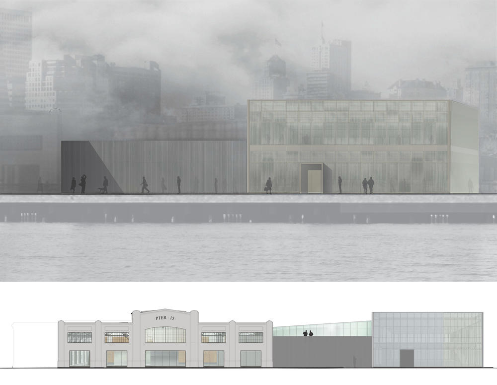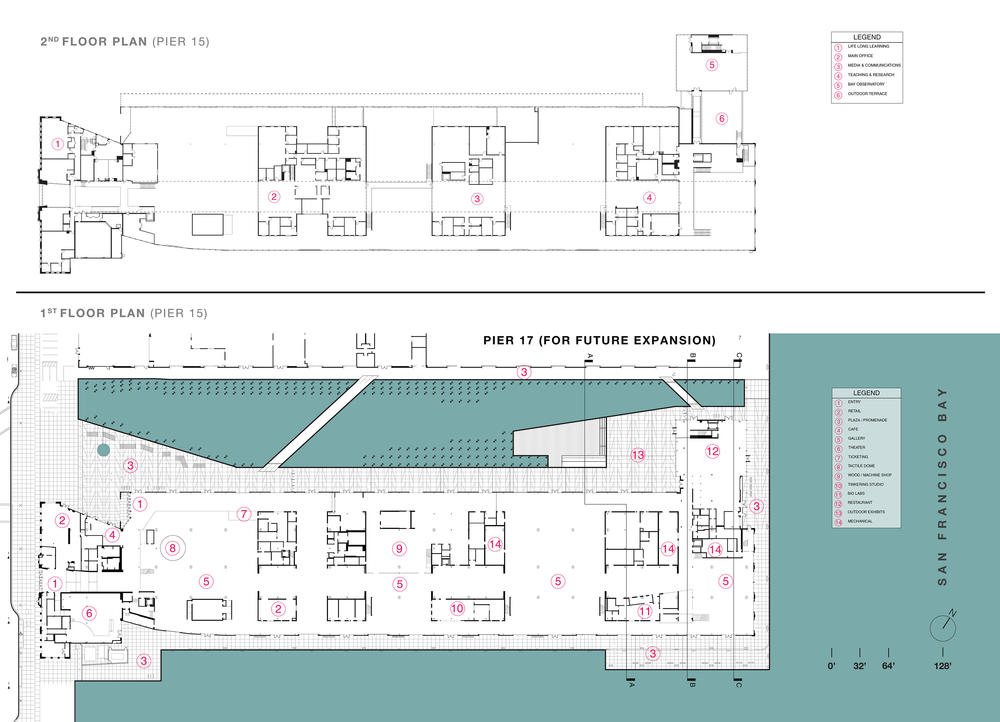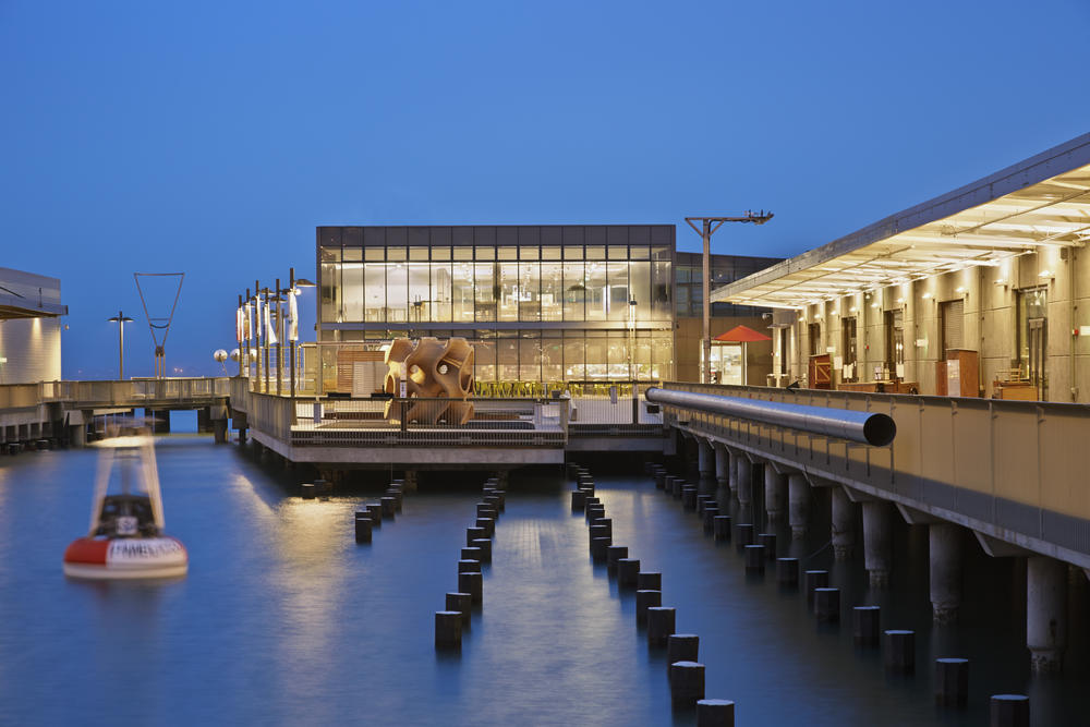 The new location has excellent connectivity to the city and includes no parking for the more than 1,000,000 visitors a year. A major new public plaza filled with exhibits and event space replaces the former parking deck between the two piers. It brings public life and energy to a formerly blank stretch of the waterfront. The design takes advantage of the original pier building’s original clerestories for daylighting, 800’ long roof for PVs, and uses the water below for baywater radiant cooling.