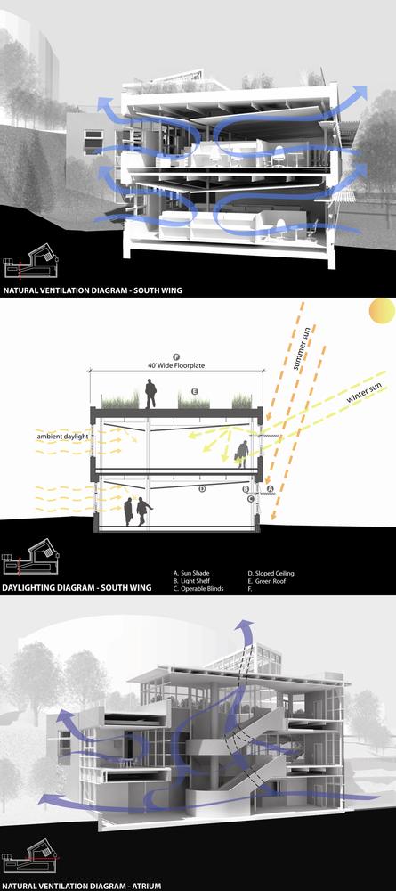During integrated charrettes, the entire team worked to design a building that connects occupants to nature and maximizes efficiency. Pittsburgh’s humid continental climate required strategies that accommodate significant seasonal temperature and weather differences. Studies showed photovoltaics would be more effective than wind in generating energy and that geothermal energy could meet the building’s imperative to operate with less than 30% of the energy required for a typical office building. The CSL’s was designed with a long, narrow floor plan to provide maximum southern exposure for daylighting and solar gain. The orientation maximizes natural ventilation via southerly spring and summer winds while minimizing exposure to westerly winter winds. Sun-tracking studies informed the design and placement of solar shades, allowing full winter sun to penetrate the building while minimizing summer solar gain. Interior light shelves provide significant daylighting throughout the year, extending natural light into the 40-foot maximum-width office space. The atrium is unconditioned; extensive use of concrete and phase change material provides thermal mass that, when managed via automatic shade cloths, window walls and roof top vents, creates comfortable conditions. Deciduous trees and vines covering exterior concrete walls aesthetically integrate building and landscape while improving energy performance of the building envelope.