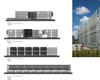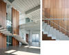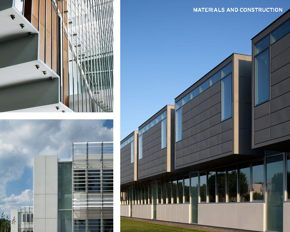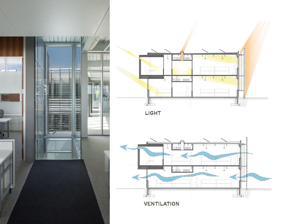 An Ideal building footprint depth is employed to deliver daylighting throughout. Louvered sunscreens, with horizontal blades and vertical fabric panels at the south elevation of each wing, reflect daylight deeply during all seasons, block unwanted summertime heat gain and allow passive winter heating. The parabolic profile reflects high elevation summer sun off of the curved portion and low winter sun angles off of the flat portion of the louvers. Zinc-clad office enclosures cantilever from the north elevations, taking advantage of diffuse northern light.