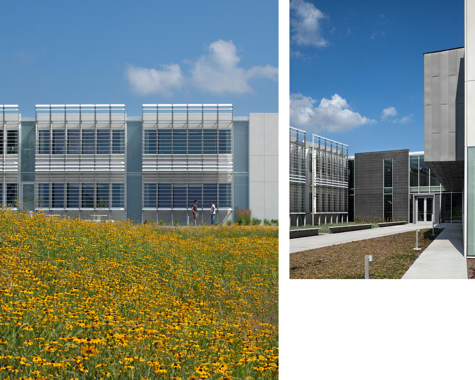 The site’s native prairie restoration provides wildlife habitats for native species. Tall-grass prairie once covered the majority of the state, but within 15 years of the Civil War, it was virtually wiped out. The native prairie restoration occurring on-site, a symbol of the pre-settlement state of Iowa, has multiple benefits in that it comprises significant components of the stormwater treatment train, slows the rate of stormwater flow and establishes a wildlife habitat; the native landscape eliminates the need for site irrigation.