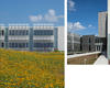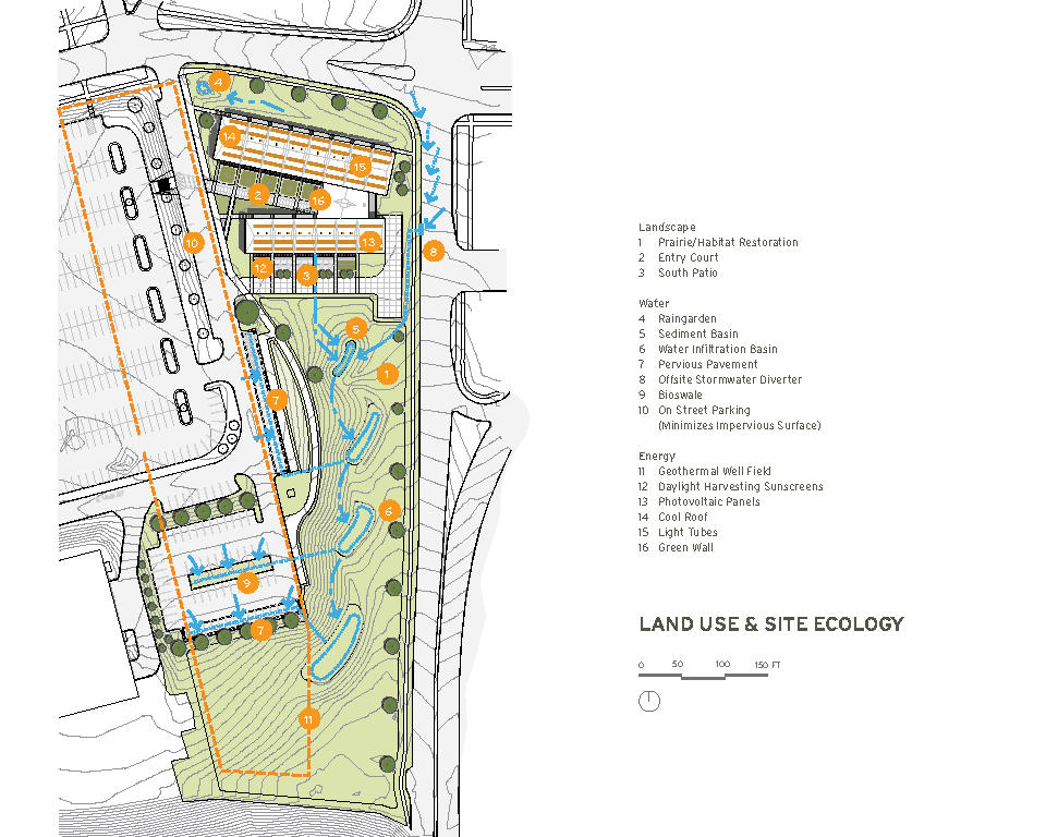 The southern half of the 6-acre site employs two site strategies for strong site ecology: a native prairie restoration and a treatment train to filter and capture on-site stormwater (plus that of six additional acres of off-site diverted stormwater).