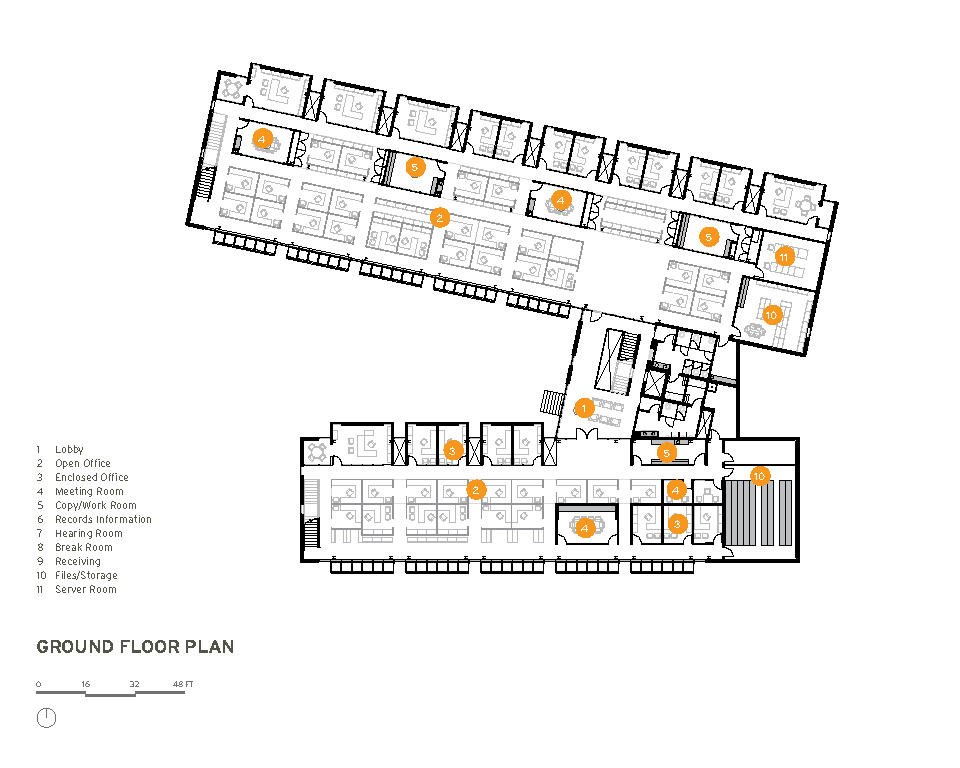 It’s impossible to tell the story of this building without mentioning its core goal: an energy use intensity of 28.0 kBTU/SF per year, equivalent to 60% energy savings beyond the energy code baseline (ASHRAE 90.1–2004). As home to the regulator of utilities, leading by example is an appropriate mission. Every decision — from envelope to materials to controls — was made with this goal in mind. The project demonstrates a “net-zero-ready” approach. Loads were reduced to the point that on-site renewable energy was appropriate, knowing more could be added later. The sound and affordable strategies, when innovatively maximized for efficiency, are a model for replication in other facilities. The project is performing at 67.9% energy savings prior to consideration of on-site renewable energy production. The project captures 100% of stormwater (based on average annual rainfall) and diverts stormwater from 6 acres of adjacent streets for on-site treatment, something particularly important due to recent catastrophic flooding within the state. State law dictates that these two agencies share a building; however this forced synergy also created design efficiency through shared and adaptable spaces. The sleek use of materials confronts the idea that structural finishes can become elegant articulation.