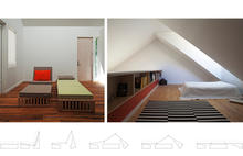 Furniture is also designed to enhance versatility. The swing space closet is designed as a mobile storage cabinet. Two chairs with ottomans can be unfolded and joined to create a standard full-size bed; alternately the four pieces slide together to form various couch arrangements.