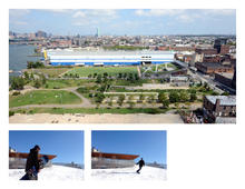 (top) Aerial view of park and building; (bottom) Active Design usage, snowboarding on roof 1/22/2014 - Photo Credit: (top) Malcolm Pinckney © 2013 New York City, NYC Parks ; (bottom) Jeremy MoseleyThe Bushwick Inlet Park transforms the Brooklyn waterfront from a brownfield industrial strip into a public park. Located in the Williamsburg section of Brooklyn, the design is the first step of an ambitious waterfront redevelopment along the East River. The design team has integrated a program of athletic fields, community facility and a NYC Park maintenance and operation facility into a 6.2-acre park.