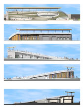 Rendered elevations and section - Photo Credit: Kiss + Cathcart, Architects © New York City, NYC ParksDaylight: Despite the fact that the building is under a bermed hill, daylight is provided to all interior occupied spaces. Horizontal light shelves on the office windows in the maintenance facility reflect light further into the rooms.