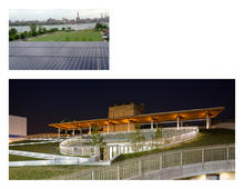 Photovoltaic panels on upper canopy and exterior at night - Photo Credit: (top) Kiss + Cathcart, Architects; (bottom) © Paul Warchol