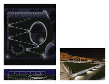 Exterior lighting diagrams and night photograph - Photo Credit: (left) AWA Lighting Designers Inc. © New York City, NYC Parks; (right) © Paul Warchol Bushwick Inlet Park has a high performance building envelope and mechanical systems, and energy modeling calculates it will save 51% of energy compared to Ashrae 90.1-2004 baseline.