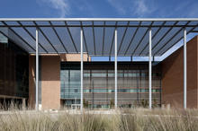 SAMMC is home to a world-class burn treatment and recovery unit, and the design both accommodates this function and draws its architectural inspiration from it. During skin grafting, surgeons remove thin, healthy skin samples from a donor and perforate and stretch them to form a mesh that allows small samples to cover larger areas. Similarly, the brick skin of the existing building is reinterpreted in the skin of the new building as a lighter, terra-cotta mesh sutured onto the new façade. The dense screening protects burn patients from direct sun exposure while providing positive views and breaking down the scale of the exterior with striations of light and shade. A long trellis canopy spans the length of the south elevation, throwing dappled shade on the building and presenting the welcoming image of a large veranda. Under this umbrella, the footprint of the façade varies to break down the scale of a very long elevation while self-shading the building as the sun moves toward the west. Surfaces at the front edge have no fenestration, avoiding heat gain, while the surfaces at the back of the trellis are extensively glazed and shaded. These simple architectural gestures humanize the scale and image of the medical center while aiding environmental performance.