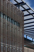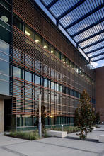 Natural materials such as stone, wood, and terrazzo are used through the project to create a warm, inviting atmosphere and keep the embodied energy relatively low. Relatively few metal and other energy-intensive materials are used, which is unusual for an institutional project. The primary material story of the project is the extensive use of terra cotta tiling and brise soleil in the façade, chosen to echo the existing brick buildings in a lighter, more diaphanous expression. Used in hot climates for millennia, terra cotta is a natural material (clay) with low embodied energy, low maintenance, and high durability. Terra cotta tiles are easily removed, replaced, reused, and recycled, and reuse commonly saves about 95% of embodied energy that would otherwise be wasted. The material also uses few chemicals in its finishing, so its health profile is excellent, compared to many other products.