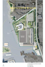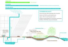 Water flow diagram. - Photo Credit: ZGF Architects LLPIntegrated site and building stormwater strategies reflect USACE’s mission and the project’s riverbank site. The Oxbow shape of the building provides a literal connection to the geography of the natural Duwamish River and to the riparian ecosystem. The project site was improved from 100 percent impervious to 50 percent permeable.