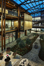 Workspaces surround the interior atrium "Commons." - Photo Credit: Benjamin BenschneiderThe integrated design-build process was essential to the overall ecologic success to the project, allowing the team to innovate and synthesize systems to exceed the required energy and water benchmarks. The design competition had a fixed delivery, requiring rigorous analysis of aesthetics, performance, construction efficiency, and cost.
