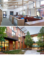 View of the courtyard. - Photo Credit: Jeremy BittermannSometimes good urbanism and energy efficiency can work against each other. Early on, the design team chose to align the building to the street grid--which is oriented 40 degrees off true north--in order to be good neighbors and affirm that sustainable buildings can “fit in.” The task was then set: if ALL direct sunlight could be kept out of southwest-facing spaces and extra attention was paid to glare control, the energy penalty would be kept to less than 5 percent as compared to an optimally oriented building.