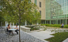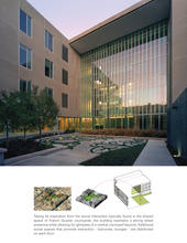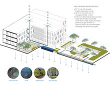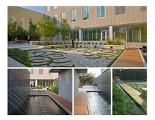 The flow of water through the site is handled as a design opportunity rather than a plumbing problem. A ‘working water feature’ captures rainwater and diffuses it to plants and soils on site, evoking the flow of water in the regional ecosystem. The water feature is also fed by the AC condensate (up to 20,000 gallons per week!), which provides all landscape irrigation on site.