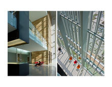 The safety standards of some lab tenants require that air be flushed through labs at rates up to 10 air changes per hour, and lofted far away from the building. They also require controlled temperature and humidity levels for reproducible experiments, making operable windows for labs generally inappropriate. By using the conditioned return air from offices as a dilutant for lab air supply, conditioned comfort can be provided to office areas at negligible energy cost. Adjacent sheltered balconies provide for connection to climate.